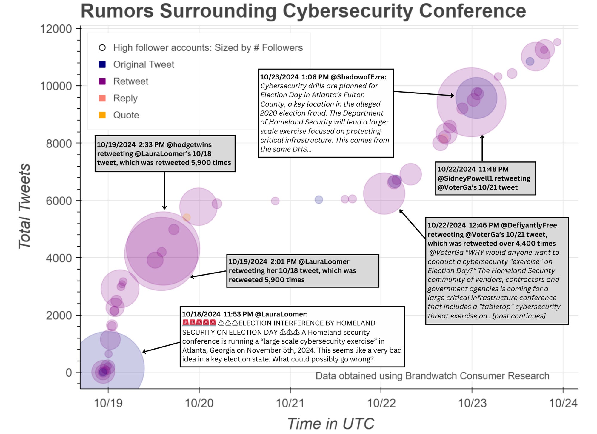 Figure 1: A graph showing the cumulative number of tweets related to rumoring surrounding the cybersecurity exercise in Atlanta. Nodes are sized by the number of followers of the tweeting account, and only accounts with 50,000 or more followers are visualized, although the y-axis includes counts for all engagement regardless of account size. For the labels, white boxes indicate original tweets, while gray boxes indicate retweets.