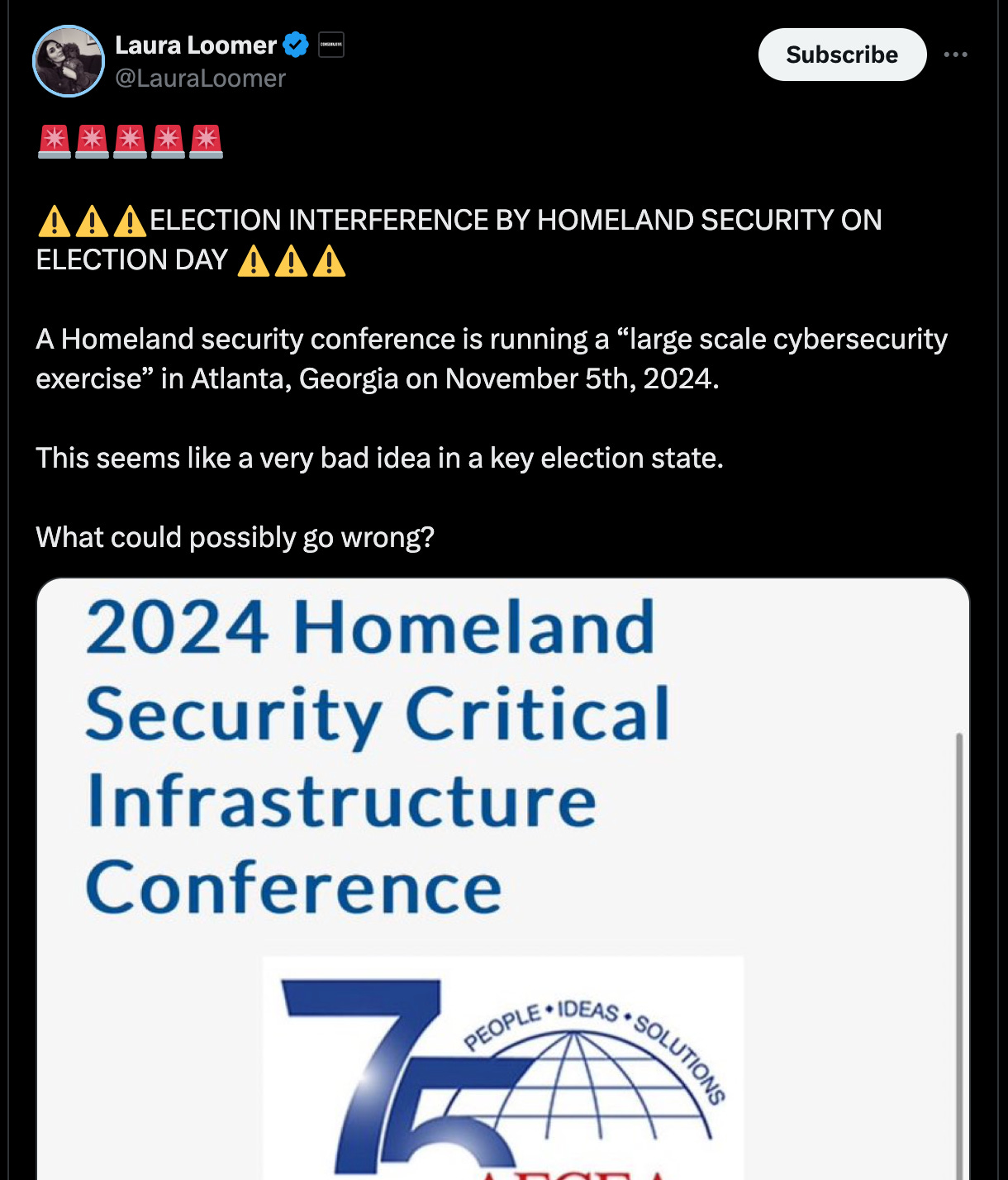 We first observed this rumor on October 18, with a post from @LaCivita (an advisor to Donald Trump’s 2024 campaign) with a screenshot of this conference exercise occurring on November 5, claiming it is suspicious. Shortly after, we saw a far larger account, Laura Loomer (a conservative political commentator who has appeared in our previous research) posting a claim that this is “election interference by Homeland Security” based on this test being run on election day in a swing state (See Image 2).